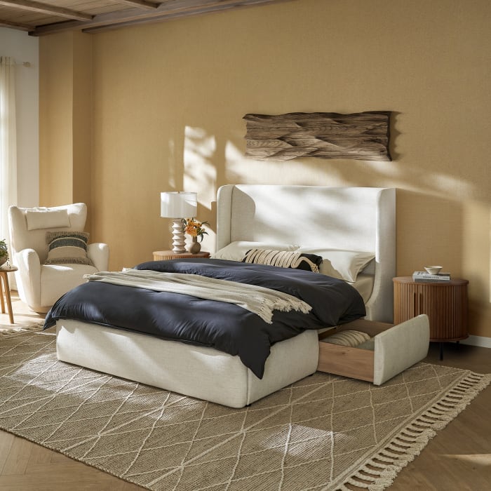 Combining style with practicality, the Dalton Storage Bed offers a sturdy pine frame, oak veneer finish, and plush upholstery. Spacious drawers provide hidden storage, making it the perfect blend of elegance and functionality for any bedroom.