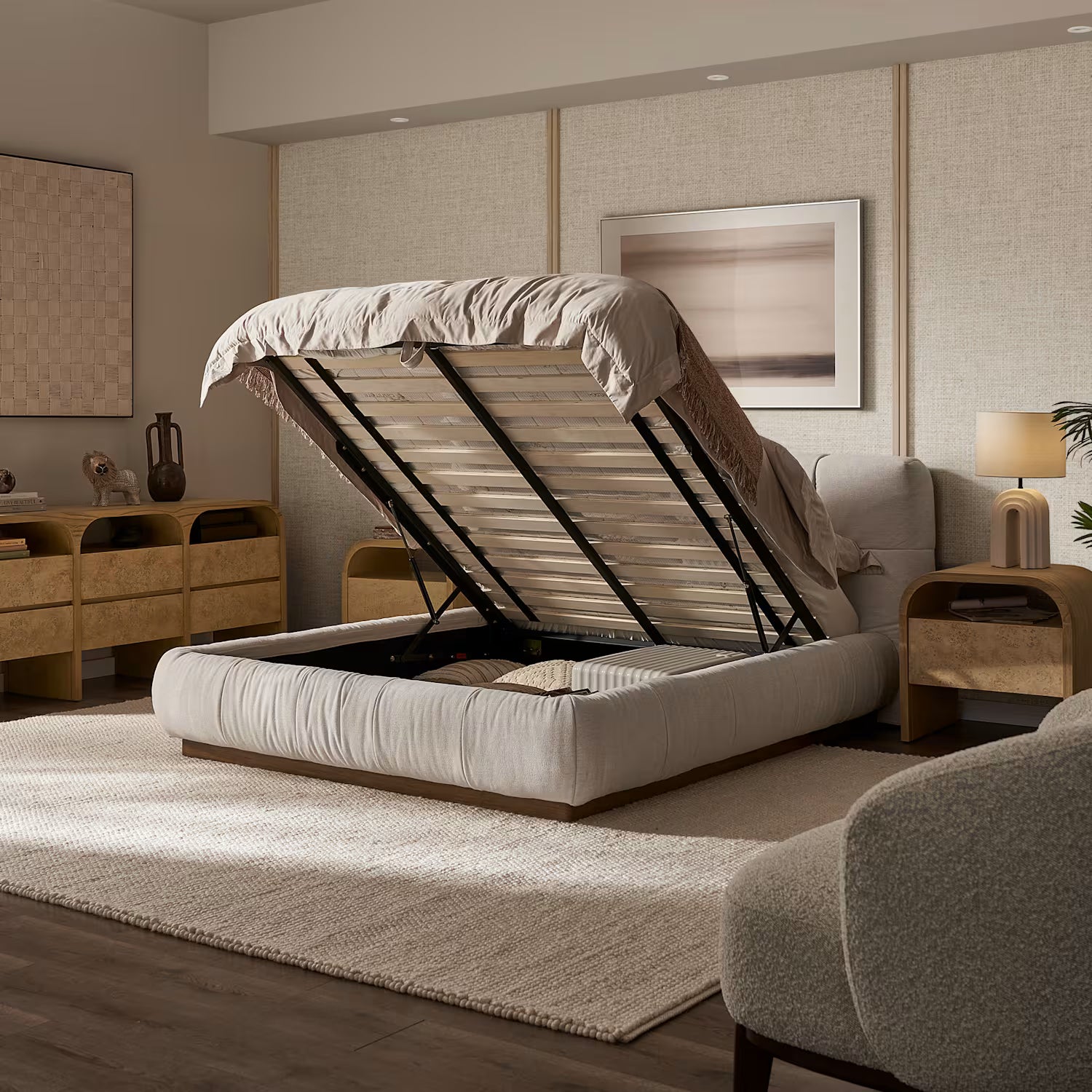 Combining style with practicality, the Dalton Storage Bed offers a sturdy pine frame, oak veneer finish, and plush upholstery. Spacious drawers provide hidden storage, making it the perfect blend of elegance and functionality for any bedroom.